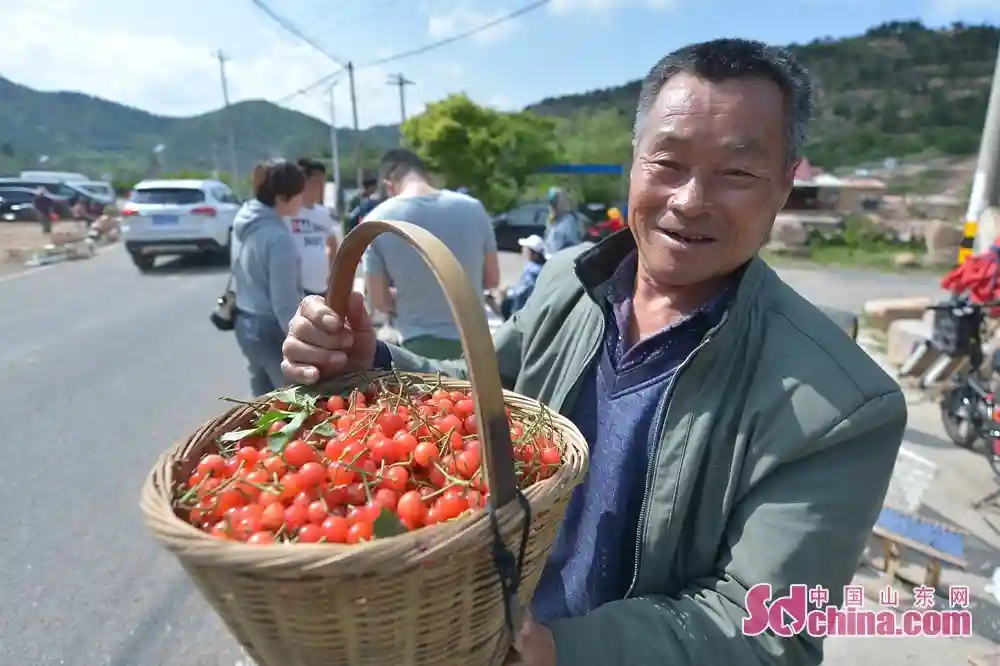 进入樱桃采摘季,青岛市城阳区惜福镇街道棉花村的村民在村口向游客展示刚刚摘下的红樱桃。