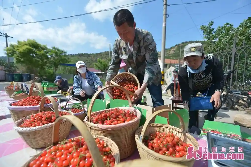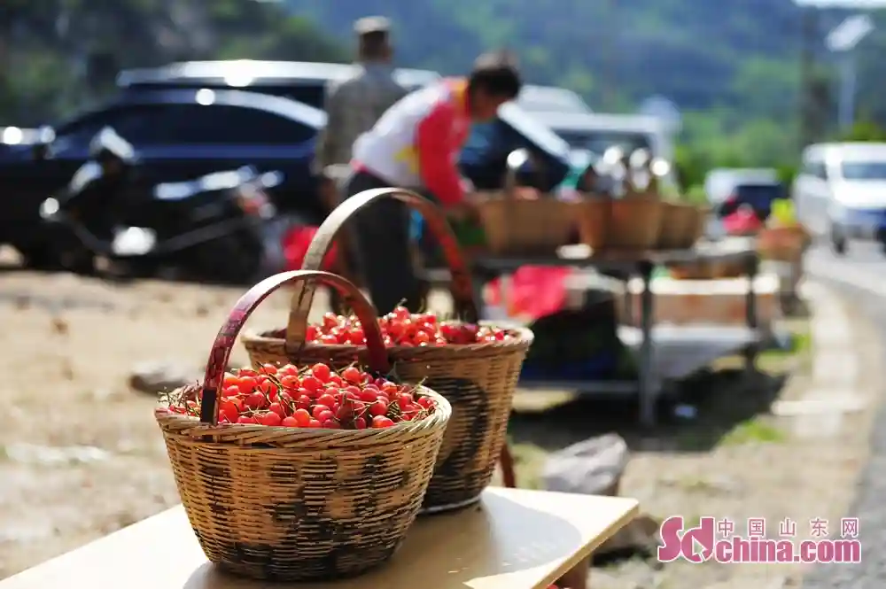 青岛市城阳区惜福镇街道棉花村的红樱桃以个大多汁闻名。图为村民在路口摆放销售刚刚采摘的红樱桃。
