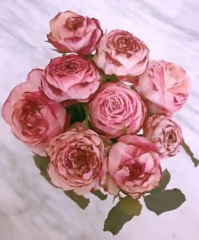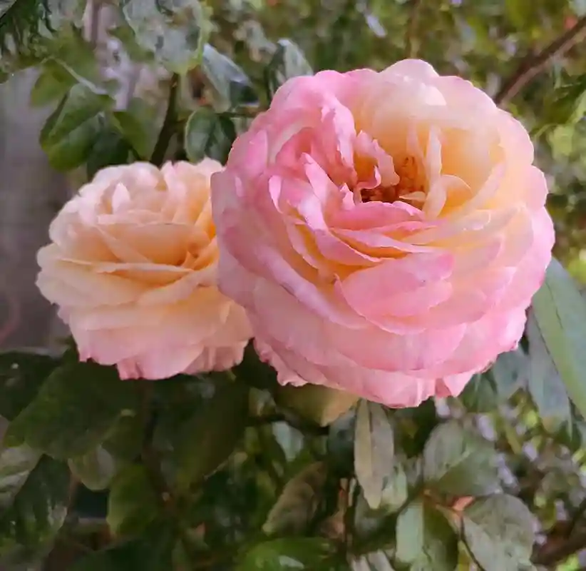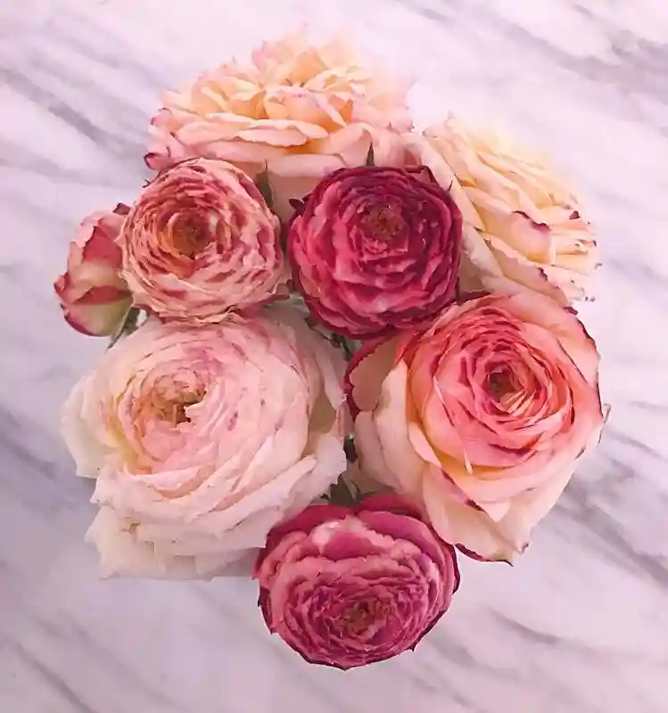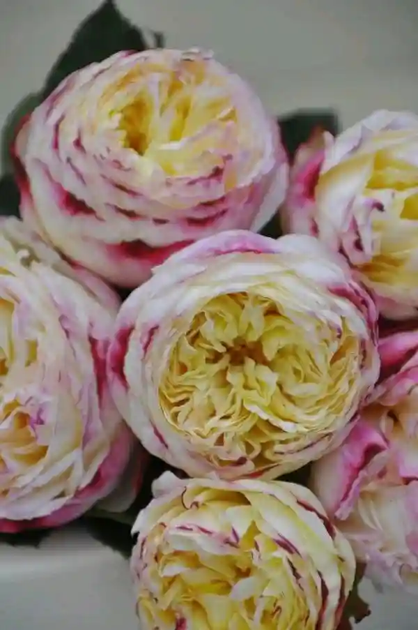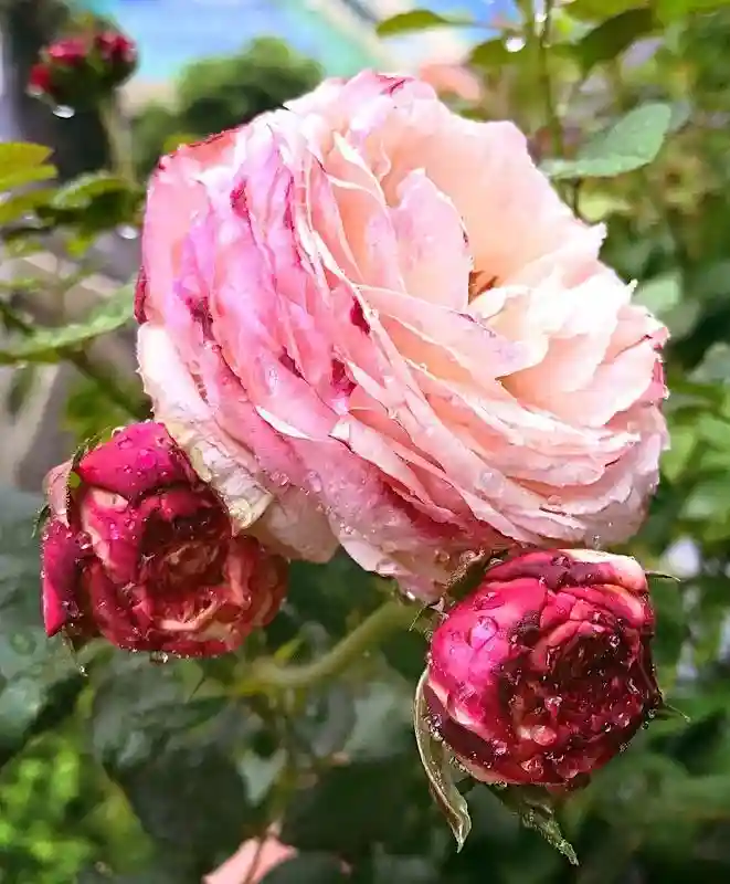 颜色:浅黄色,外层花瓣玫瑰粉色。