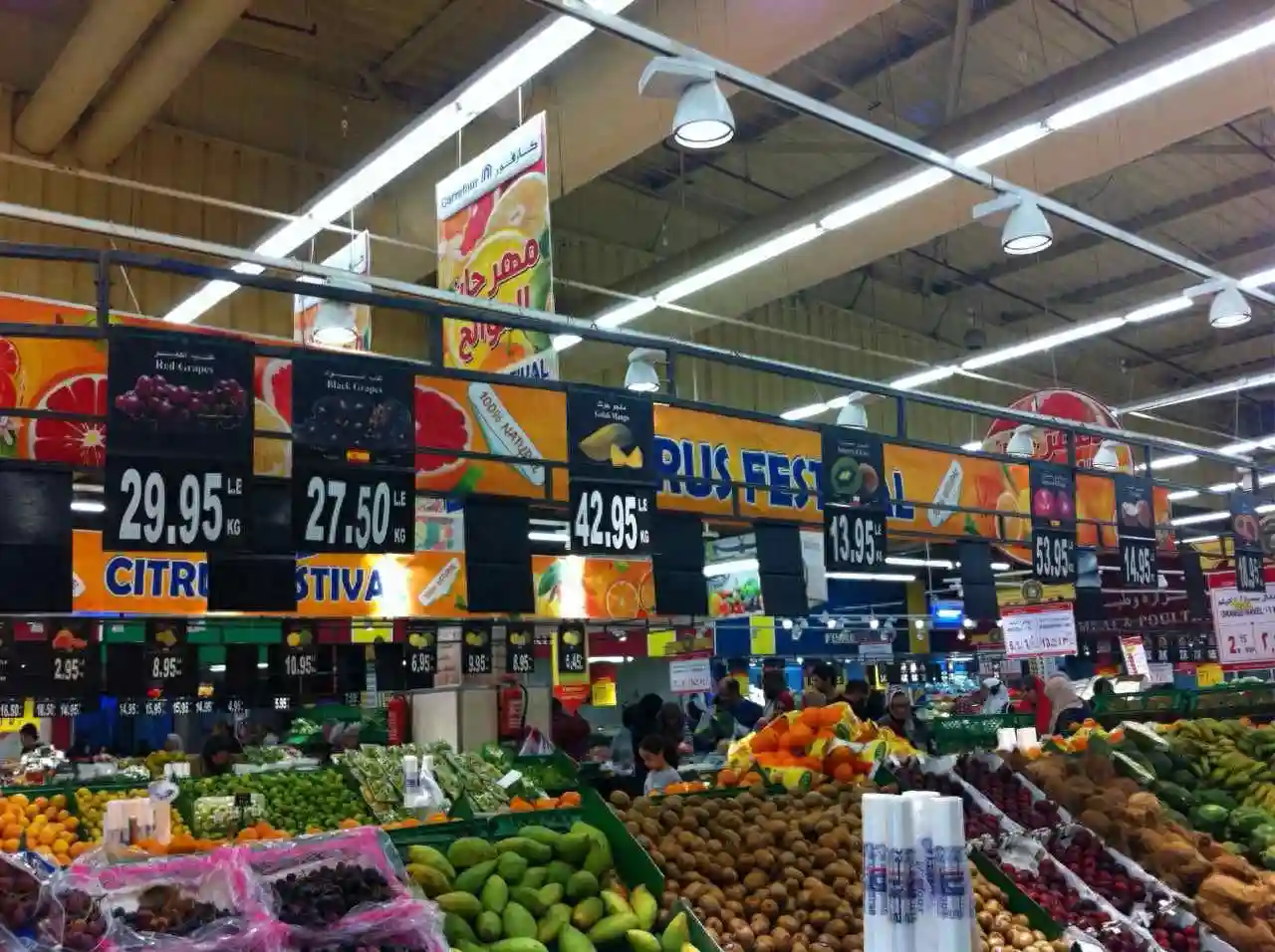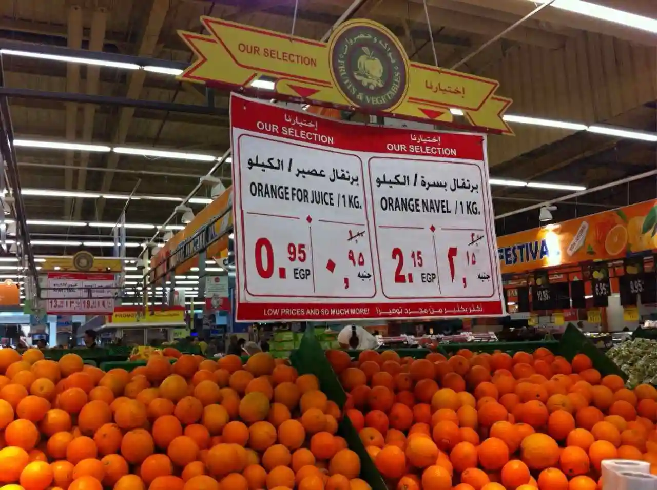 在沙漠之国,水果一定很贵吧?小编也是这么想。但去超市看到这一幕,真是惊呆了。你没看错,普通用来榨汁的橙子只有0.95埃镑一公斤,脐橙也只要2.15埃镑一公斤——1埃及镑约等于0.8元人民币。