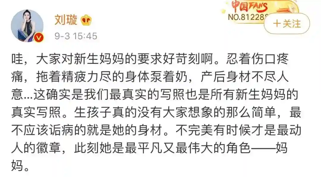 月初刚刚二胎得女的刘璇对于这条热议的新闻正有感而发。表示这种精疲力竭,也根本无暇顾及自己的状态,确实是每个新手妈妈的必经之路:“生孩子真的没有大家想象的那么简单,最不应该诟病的就是她的身材。不完美有时候才是最动人的徽章。”