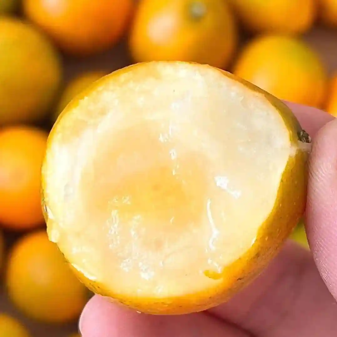 融安脆密金桔和我们平常知道的金桔,从外表到味道,真的完全不同。一口下去,“卜卜”爽脆,果肉肥厚香软,又甜又爆汁,非常过瘾!拦腰切开还有超漂亮的糖心!抱着糖心的金桔果肉,细腻、无渣。舌头一碰就化成蜜汁,桔香流动在唇齿间。