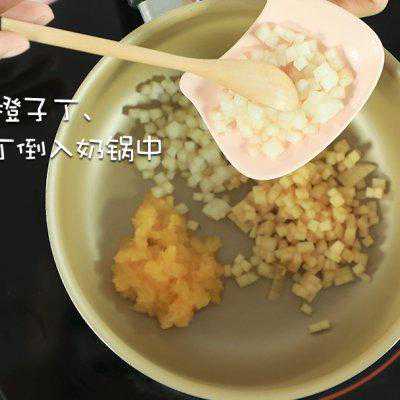 5、将苹果丁、橙子丁、雪梨丁倒入奶锅中。
