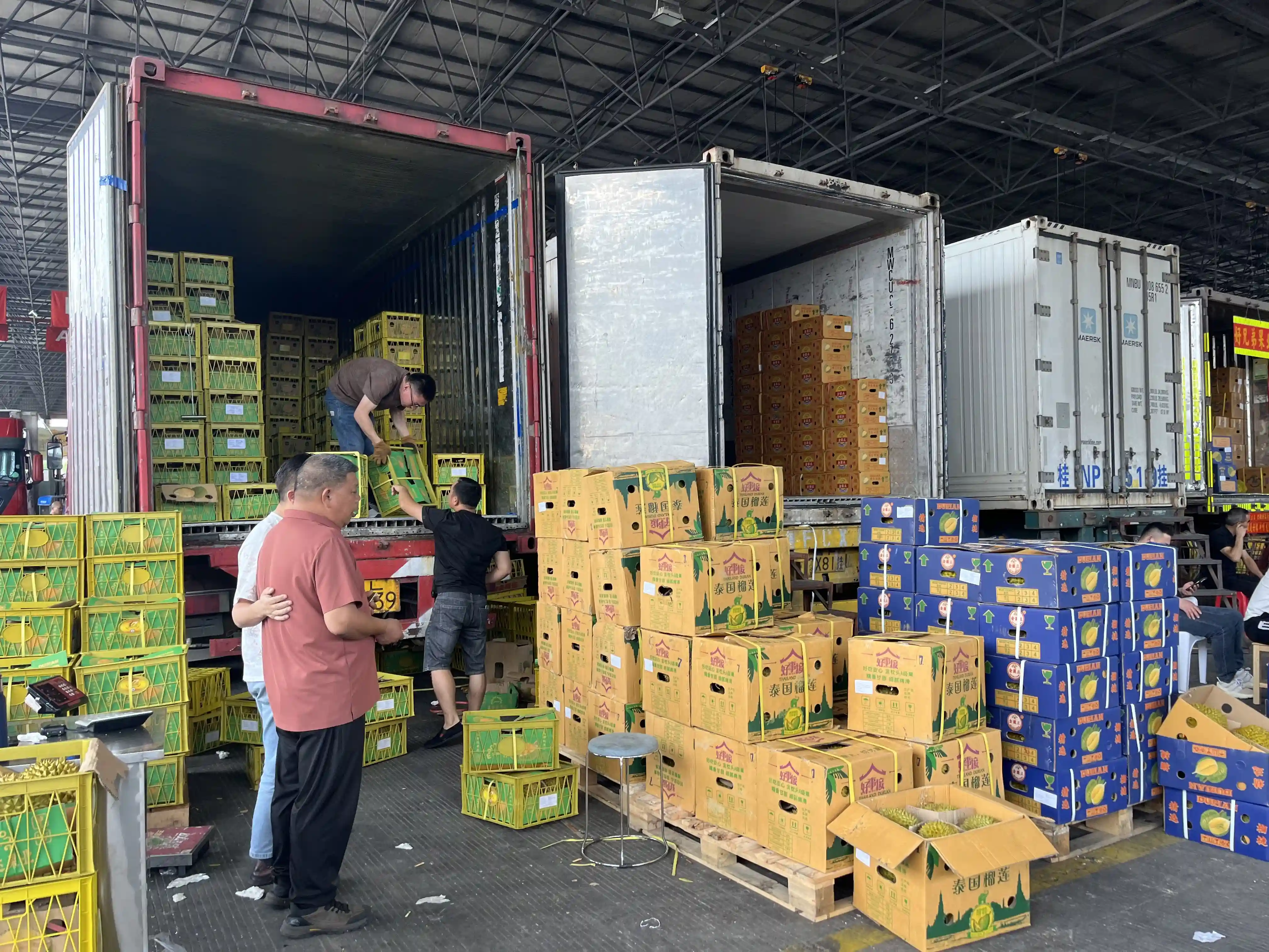 今年榴莲的火爆人气在温州水果批发交易市场也可见一斑。作为温州最大的水果批发市场,市场内的车板交易区人流如织、热闹非凡,装满沉甸甸榴莲的冷藏集装箱车排列整齐,经营户们马不停蹄地忙着搬货、装货。市场相关负责人表示,今年的榴莲销量较往年上涨明显,据本月市场的交易数据来看,5月份榴莲销量预计将突破3000吨。