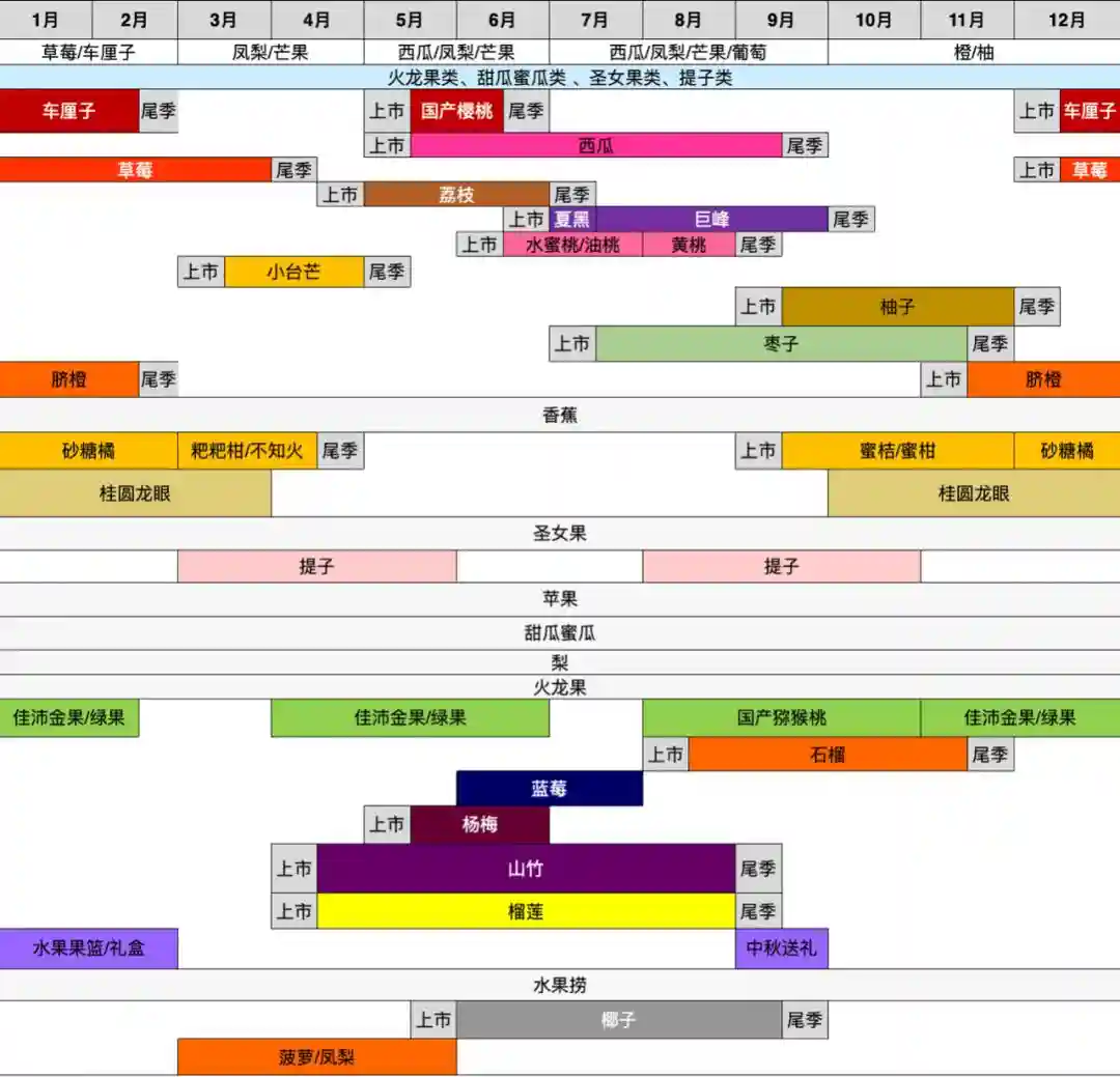 应季水果,意味着它们通常没有进过冷库,新鲜度更好,比如夏天的西瓜葡萄、秋季的柑橘梨子等。这张向水果大佬求来的表,收好不谢!