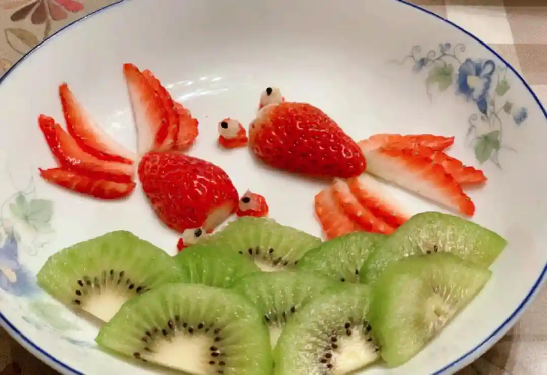 用草莓和猕猴桃营造一片湖水和游动的小鱼,仿佛在告诉人们:春节时,不仅家家户户热闹非凡,就连水中的生灵一样欢快。小鱼是活力四射,阳光自由的象征,寓意着生活如鱼得水,一帆风顺。