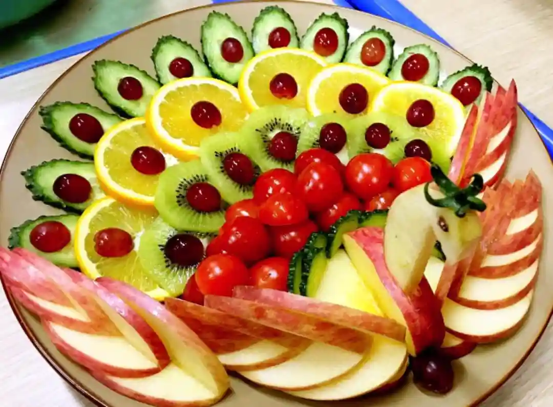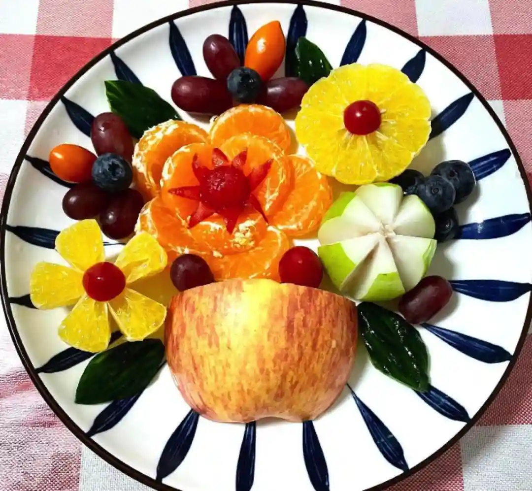 你可以利用苹果,猕猴桃,橙子,提子和圣女果等不同种类的水果去制作。摆放时可以模仿孔雀开屏的样子,美丽而吉祥,给人带来极好的视觉享受。若是喜爱其他种类的水果,也可以自由地进行调整和切换。
