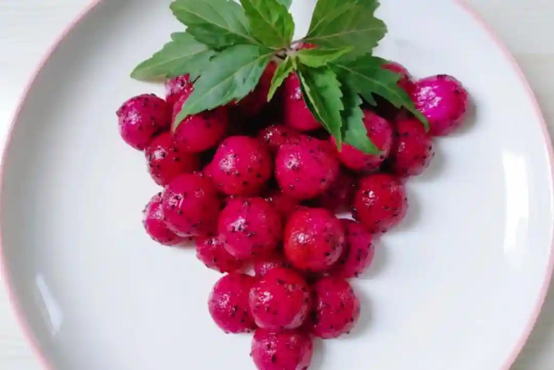 新疆吐鲁番的葡萄紫莹莹,水分充足,配上红心火龙果和点缀的绿叶,尽显南国繁华,也带来生活的丰富与多彩。用新鲜的葡萄和红心火龙果制作,葡萄象征富贵和丰收,寓意着来年生活丰富,事业有成。
