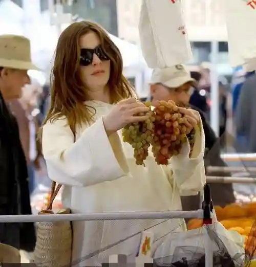 照片中,安妮·海瑟薇穿着白色上衣,一身休闲装扮现身菜市场。在挑水果时露出的迷之表情也是非常搞笑,一脸的认真。