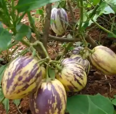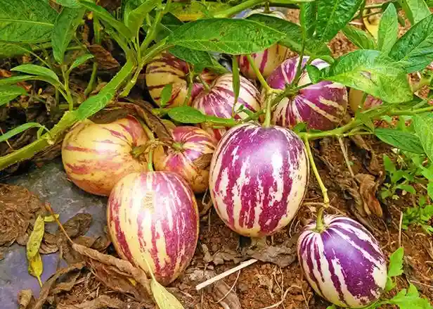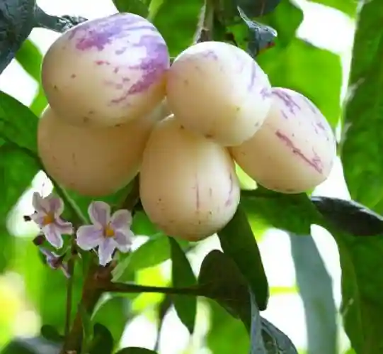 香瓜茄果实同茄子一样为浆果。果皮淡绿色,成熟后呈奶油色,因品种不同而有紫色条斑者,果形卵圆形或圆锥形、扁圆,果重40~400克。果肉奶油色,平均糖度6~10度。果实一般在开花后60天成熟。维生素c含量高。种子黄色至黄褐色,扁圆,千粒重1克左右。但从品质、糖度考虑,多用扦插繁殖而不用种子繁殖。