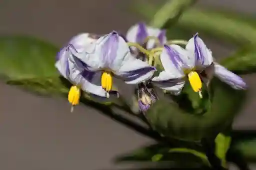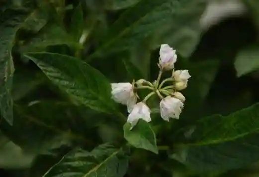 香瓜茄总状花序,着生10朵花,但一般坐果1~3个。如用有4~5片叶的枝条进行扦插繁殖,则第一花序着生在15~20节,每隔5~6节着生一个花序。两性花,自花授粉。花萼绿色,先端5裂;花冠淡紫色带紫条斑,5裂;雄蕊5枚,形成简状,包围雌蕊,花药靠合,顶孔开裂;雌蕊子房2心室,内有多数胚珠。
