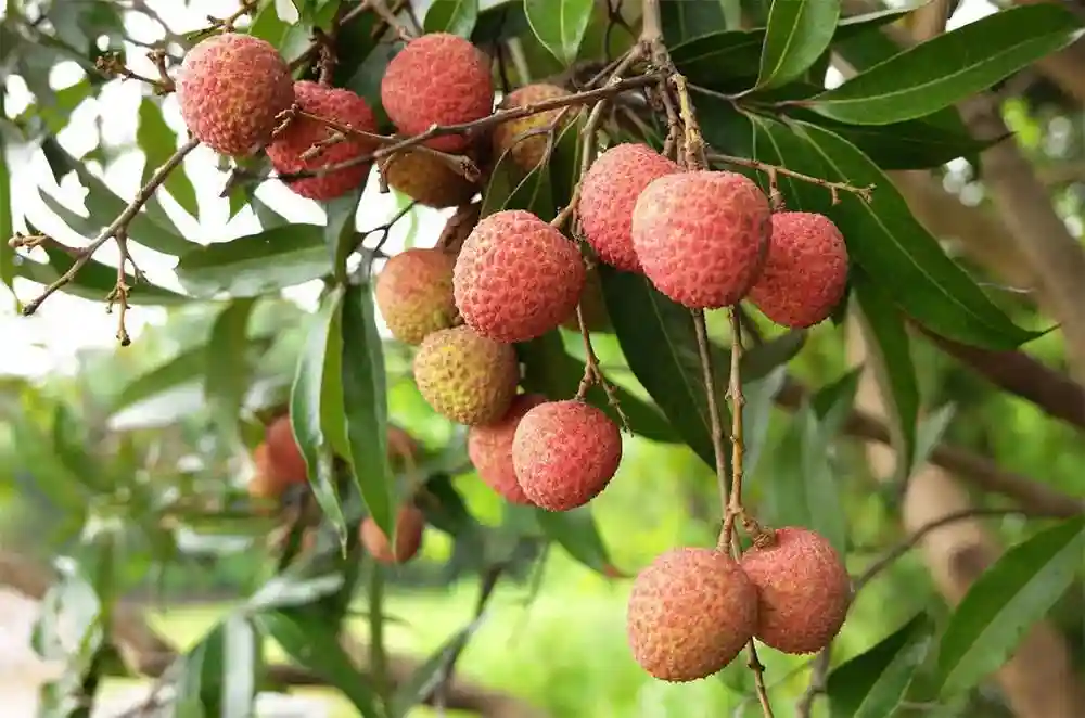 荔枝,为无患子科植物荔枝的果实。原产于中国南部,常绿乔木,其产量在中国热带水果中占10%左右,排名世界第一。中国荔枝投产面积790万亩,产量329万吨。