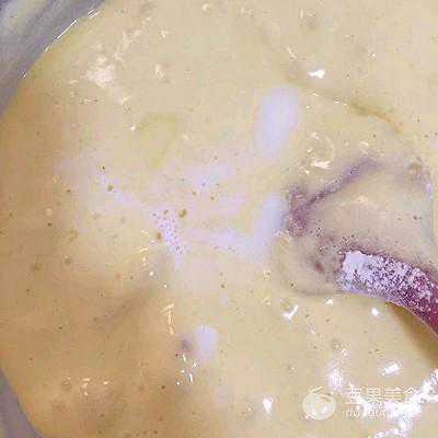 5、将牛奶混合物,倒入面糊中,翻拌均匀