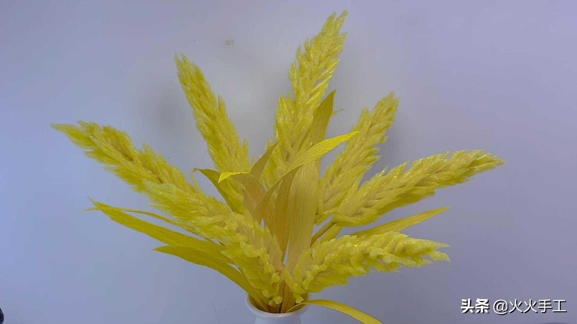 7.水果网在冬天里化身一枝红梅,那么在秋天里当然要化身成收获的喜悦。下面这个作品就是用黄色的水果网做成的麦穗,有没有五谷丰登的感觉呢?