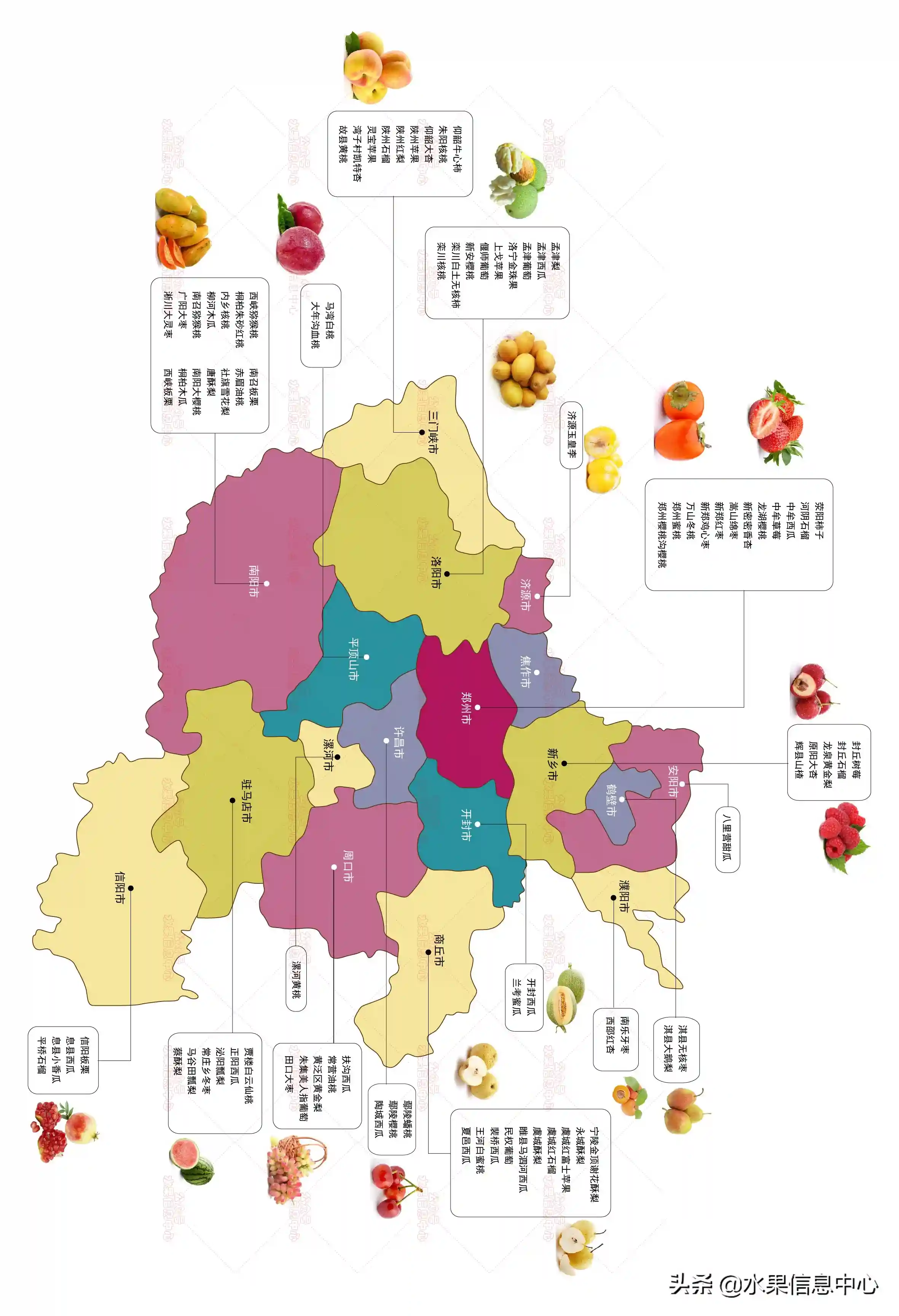 河南是传统的粮食作物大省,比如小麦,玉米等,相比河南水果的种植面积不算大,水果种植面积在全国属于中上游水平,品种主要以苹果,梨子,桃子为主,下图为河南各市的特色水果分布图。