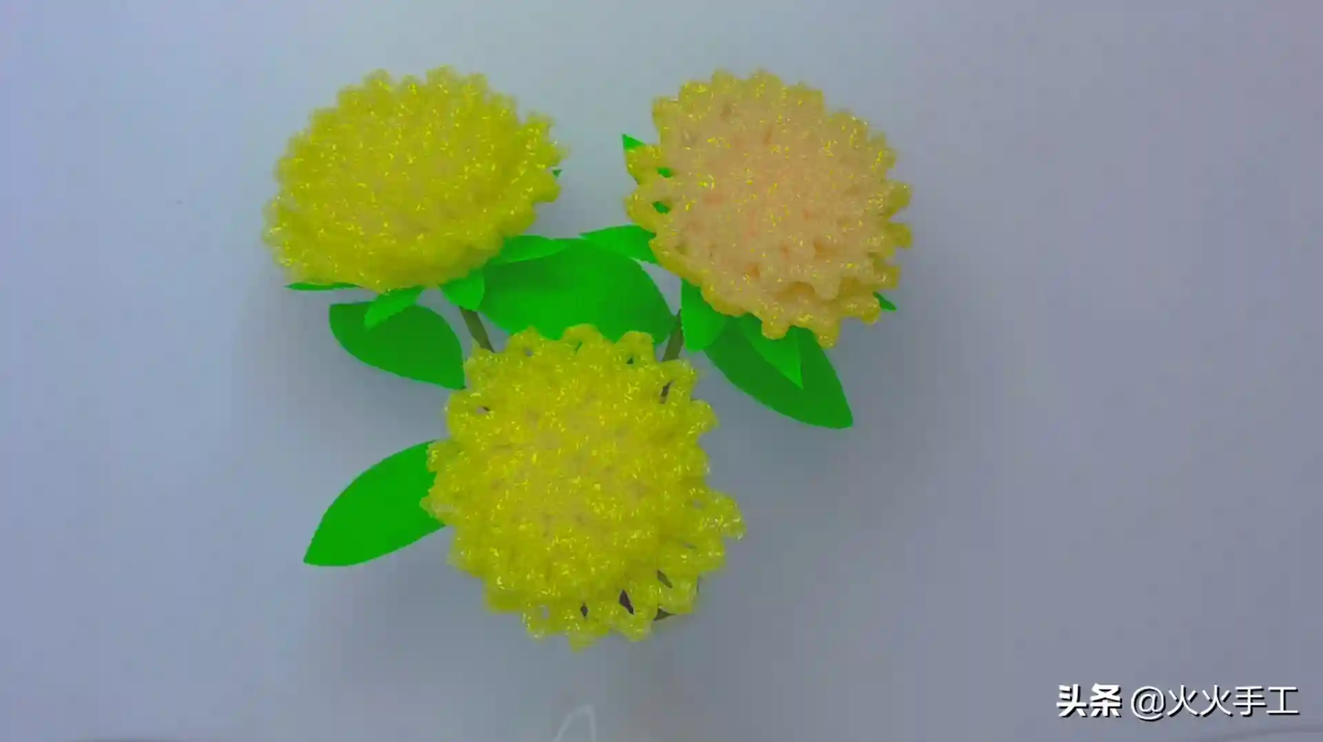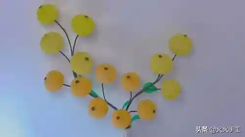3.这个用橘色和淡黄色水果网做成的小枇杷,是不是也还挺好玩的呢!就是应该是下坠的,这里是朝天长的。