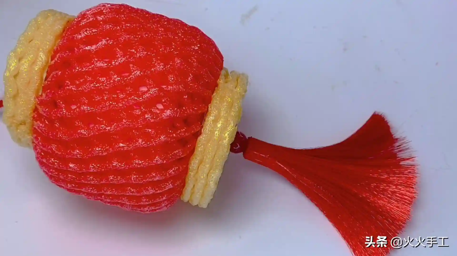 5.这日子眼看就快过年了,过年少不了红灯笼。看,这不就用红色水果网做了一个红灯笼,再加上丝带做的流苏,也是挺不错的。新的一年就要红红火火啦!