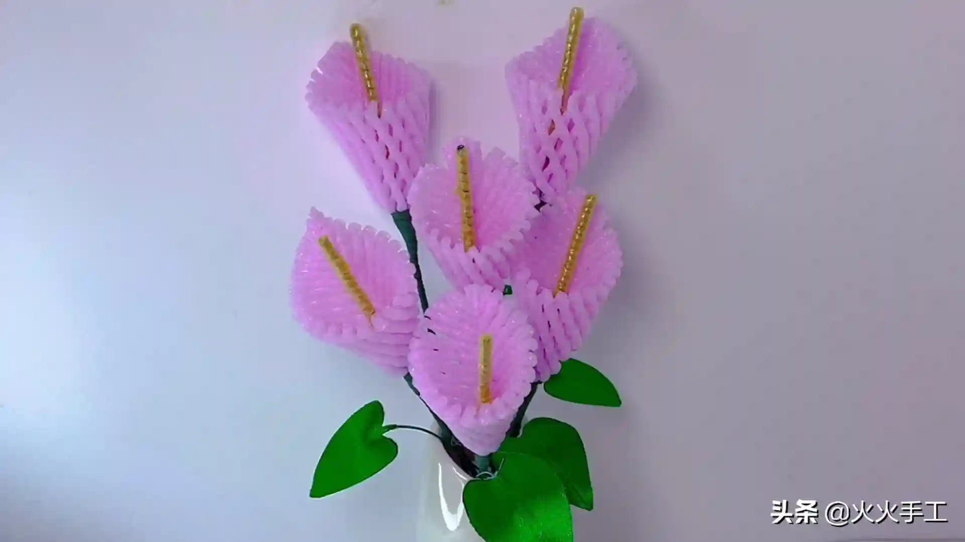 6.每逢新年也是天下有情人终成眷属的时刻。过年很多新人都走进婚姻的殿堂。在婚礼上有一种花几乎是常客——粉色马蹄莲。粉色马蹄莲象征爱你一生一世,我们用粉色水果网也可以简单完成,喜欢的话,不妨试一试。