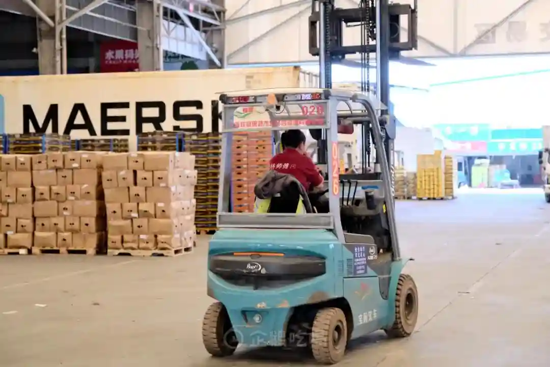 在这里,水果的基础计量单位是箱,而交易起来,都是整车整柜的订单,叉车+大货是标配出行工具。