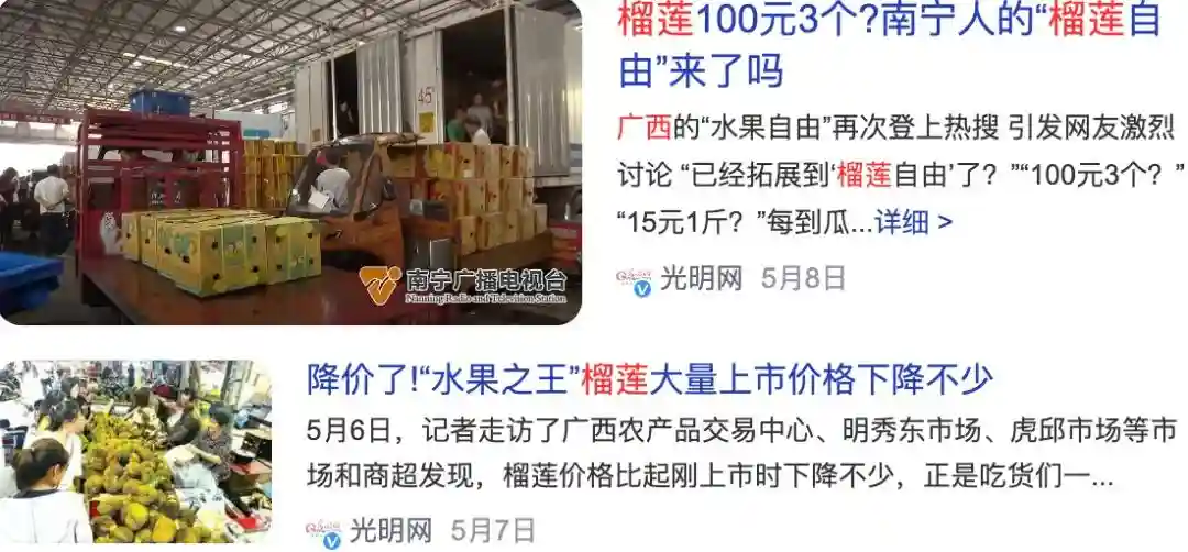 但是在水果滞销的时候,价格也会越卷越低。比如今年是榴莲大年,由于供过于求导致的低价倾销,广西已经出现10元一斤的金枕……