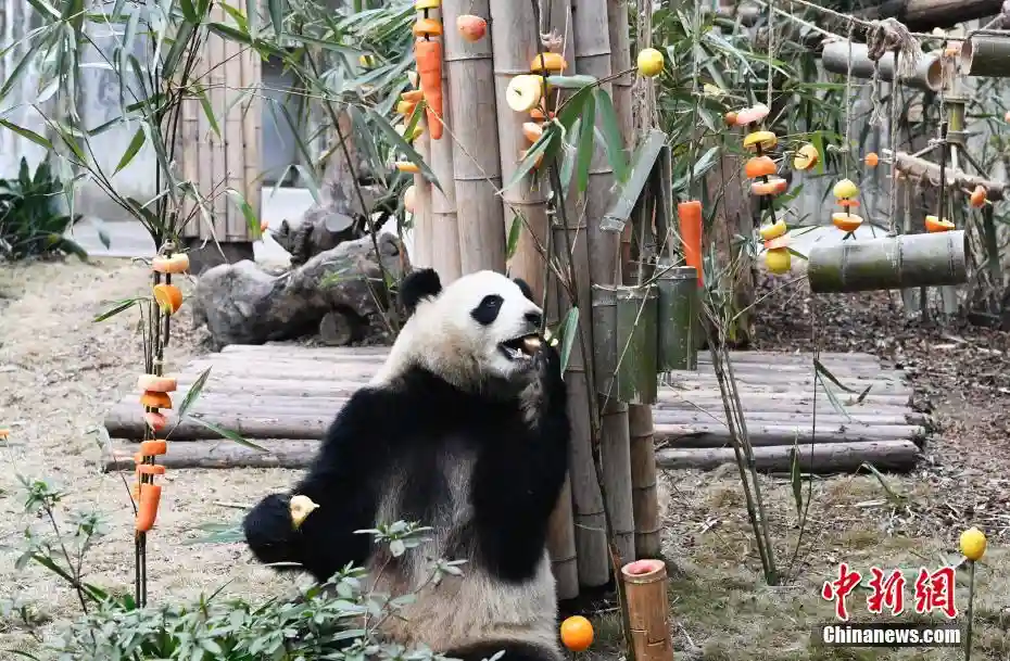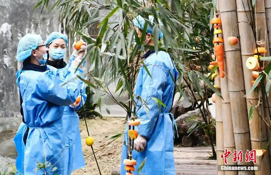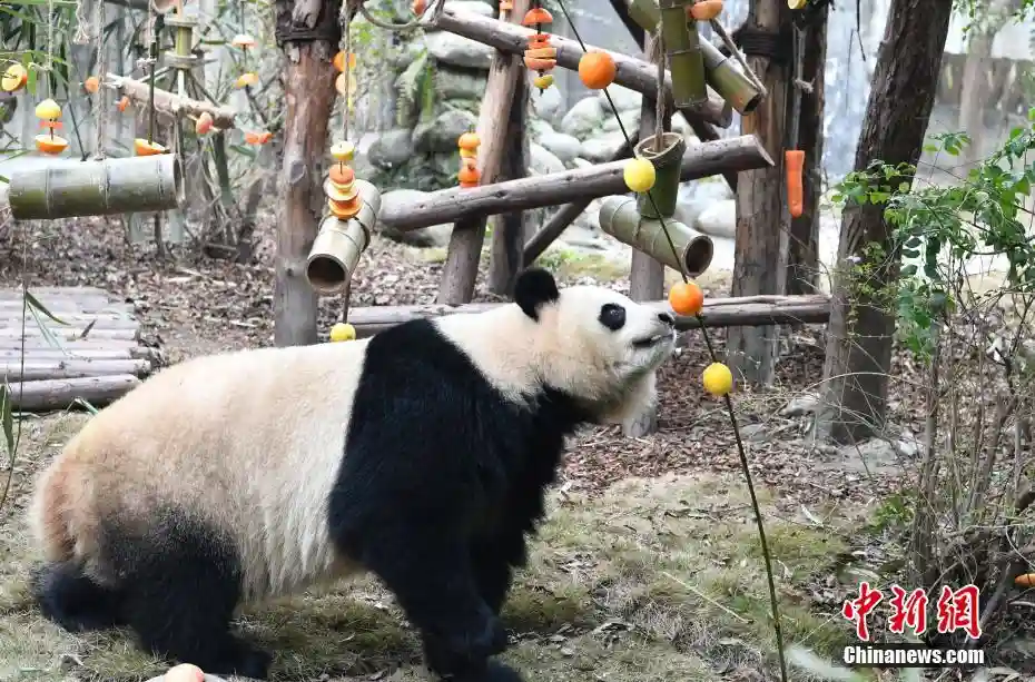 1月23日,成都大熊猫繁育研究基地为大熊猫举行2019年新春丰容活动。饲养员们为大熊猫“淼淼”准备了水果礼物,希望通过丰富的水果气味增添大熊猫在室外活动场玩耍的乐趣。丰容是动物园术语,在圈养条件下,丰富野生动物生活情趣,满足动物生理心理需求,促进动物展示更多自然行为而采取的一系列措施的总称。中新社记者安源摄