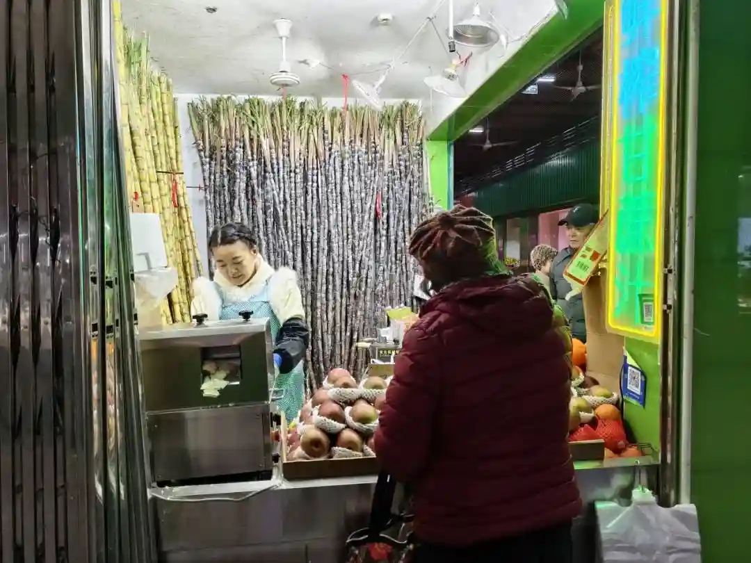 除了销售甘蔗之外,这里的甘蔗店还为顾客提供“鲜榨甘蔗汁”服务,现场买完甘蔗后直接榨汁装瓶,一瓶8元、两瓶15元。