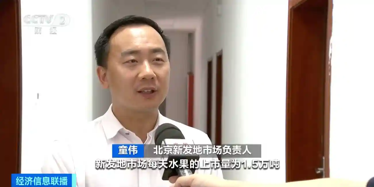 北京新发地市场负责人童伟:新发地市场每天水果的上市量是1.5万吨,有270多个品类,供应特别充足。夏天的水果像西瓜有比较明显的降价,麒麟瓜由每斤2.4元下降到每斤1.8元。