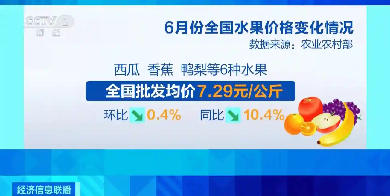 农业农村部数据显示,6月份重点监测的西瓜、香蕉、鸭梨等6种水果全国批发均价为每公斤7.29元,环比下降0.4%,同比下降10.4%。