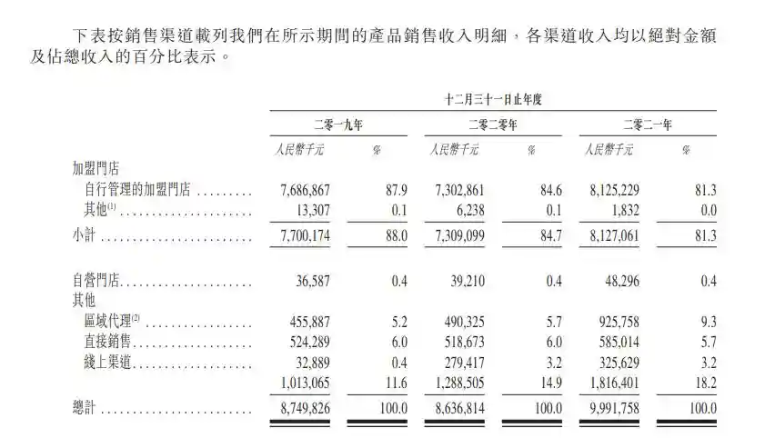 2019-2021年,来自加盟门店的销售收入分别为77.00亿元、73.09亿元和81.27亿元,占比分别为88%、84.7%、81.3%。与之对比,自营门店收入历年来占比仅为0.4%。