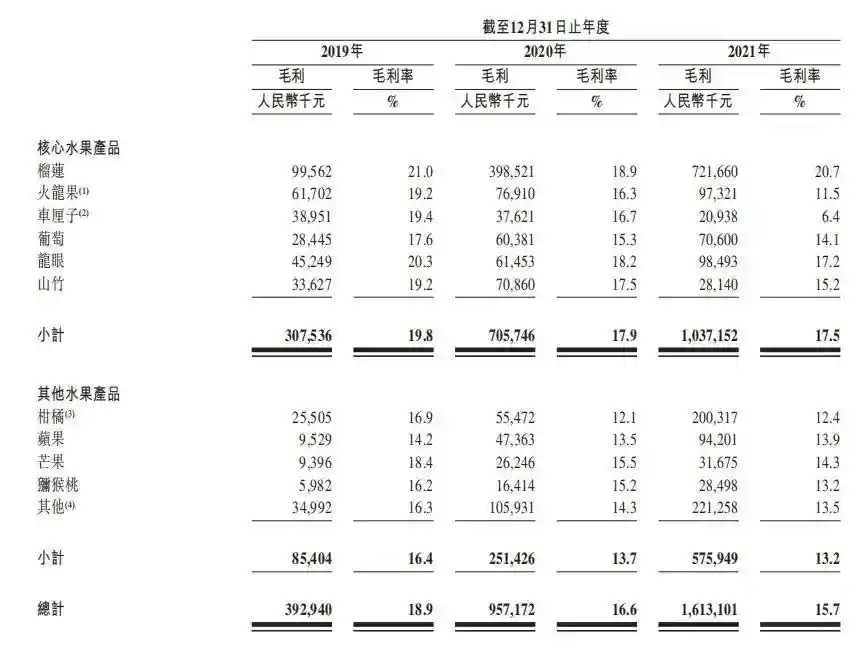 洪九果品的核心水果产品和毛利,图源招股书