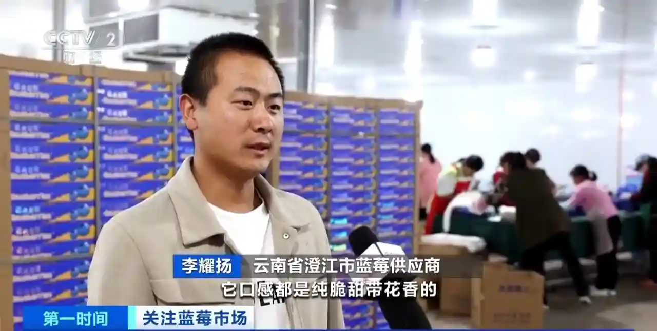 云南省澄江市蓝莓供应商李耀扬:今年云南新种了两个品种,口感都是纯脆甜带花香的,卖得特别好,我们现在每天可以发六七吨蓝莓。