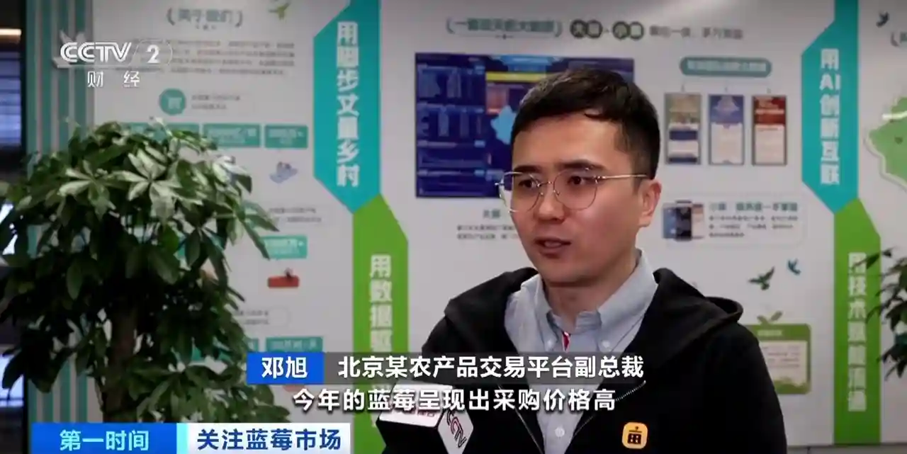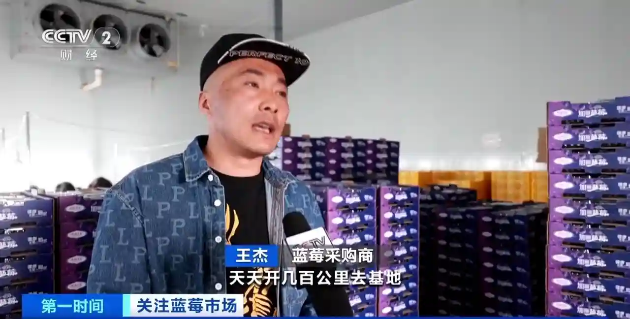 蓝莓采购商王杰:天天开几百公里去基地、包装车间,找货、订货,一天还能订到七八吨,但达不到预期。大家伙都在抢,一天需求量要十三吨至十四吨货。