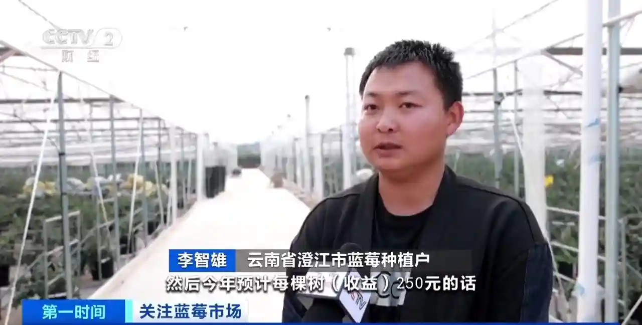 云南省澄江市蓝莓种植户李智雄:74亩总投资760万元左右,今年预计每棵树收益250元,可能回到700万元左右,第二年就开始挣钱。