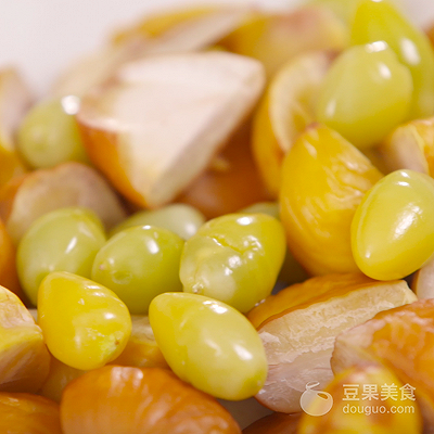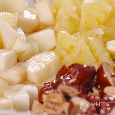 4、桃子去皮后切去内芯,改刀成块状;红枣对剖后去核,切成片状;栗子、糖水菠萝也切成适口大小;