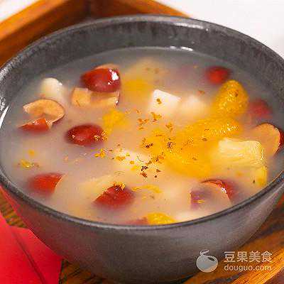 5、锅中加水,水烧开以后加入小圆子,煮到浮起,放入冰糖调味,加入红枣、栗子、白果稍煮,再放入桃子、糖水菠萝和橘子,起锅前加入水淀粉勾薄芡,也可以用藕粉水代替,最后撒干桂花增香。