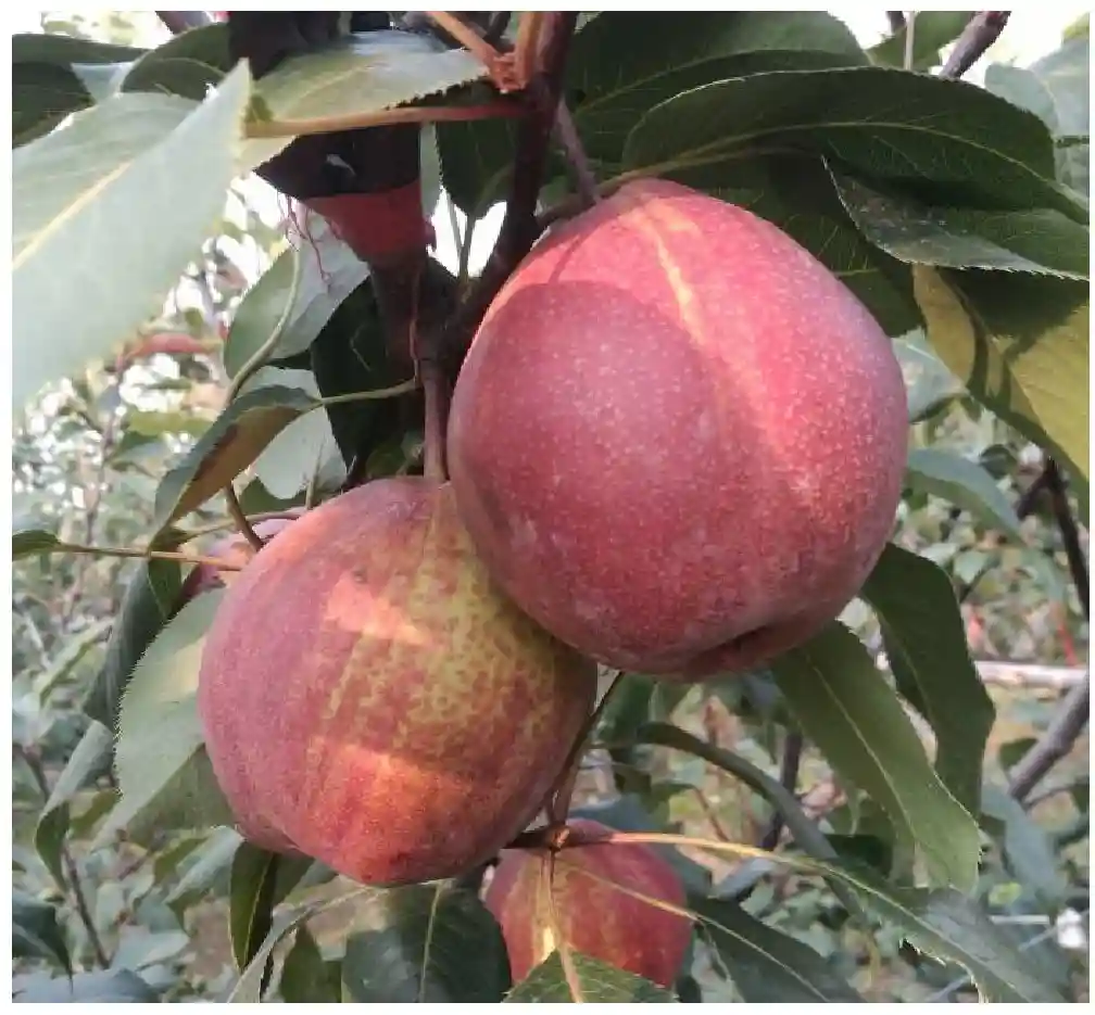 我们正经的来聊聊这个把我当色盲的红香酥梨。红香酥梨在河北、山东等很多地区都有种植。它是红皮梨中的一个优良品种。特点是“红花,红果”。也就是说,正经的红香酥梨至少是果面上带有红晕,品级高的红香酥梨应该三分之二以上的果面都是红色的。
