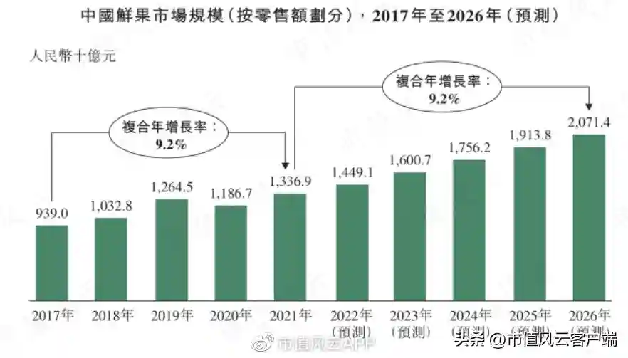 根据灼识咨询,中国鲜果市场规模过去5年的CAGR为9.2%,可见公司收入增速远超行业整体水平。