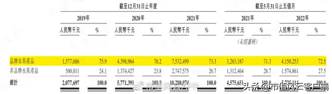 长期以来,公司的营收结构中,七成以上来自品牌水果产品。2022年1-5月,品牌水果产品的营收占比为72.5%。
