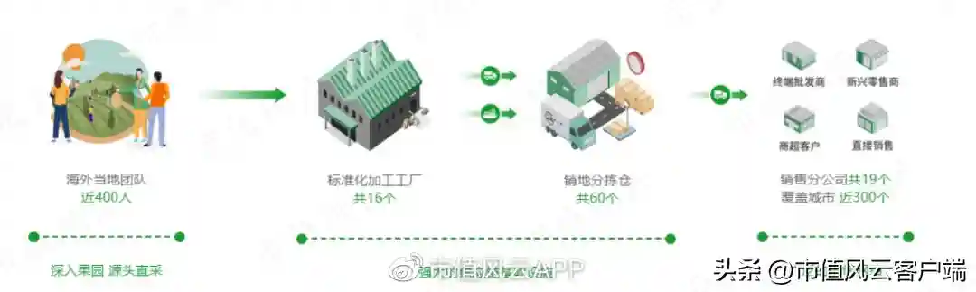 简单来说,即公司在水果原产地进行深度布局,在下游销售端建立起覆盖全国的网络,并简化中间流通层级的供应链,将水果原产地与零售终端直接连接。
