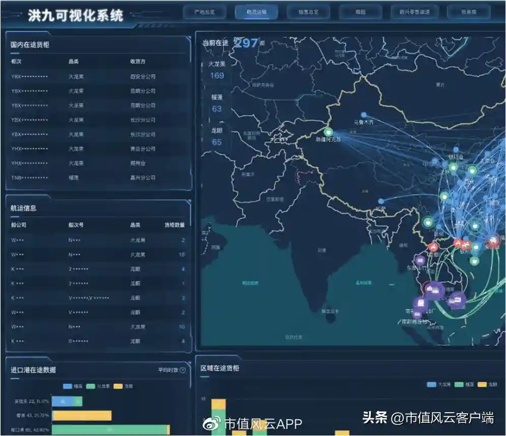 公司拥有业内领先的数字化供应链管理系统“洪九星桥”,通过系统分析订单信息、运输资源、上游供应及市场需求,可确保水果在保鲜期内到达销售地以满足高峰市场需求。