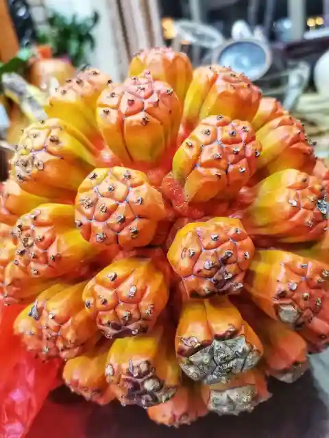 •露兜果(山菠萝):这种水果一般很少见,不管是超市还是水果店里都很少见。有人怀着好奇的心买了一个,吃了之后觉得很后悔。不但里面没有多少果肉,而且很难吃,只感觉稍稍有一点甜味而已。