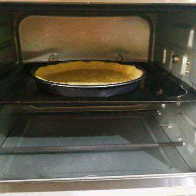 7、披萨盘提前抹上一层薄薄的油防粘,把擀开的面片铺上。
