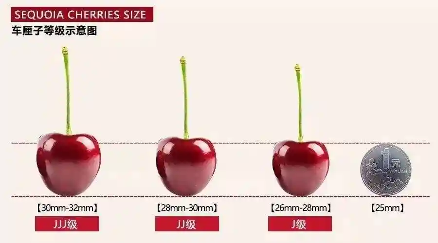 J(jumbo)是南半球车厘子分级常用的单位,在水果批发市场里,J的行话不读“杰”而读“沟”,“J”的数字越多,代表樱桃的个头越大。一般来说,果径26-28mm为单J,28-30mm的为JJ,30-32mm为JJJ。果径越大等级越高,吃得越过瘾。