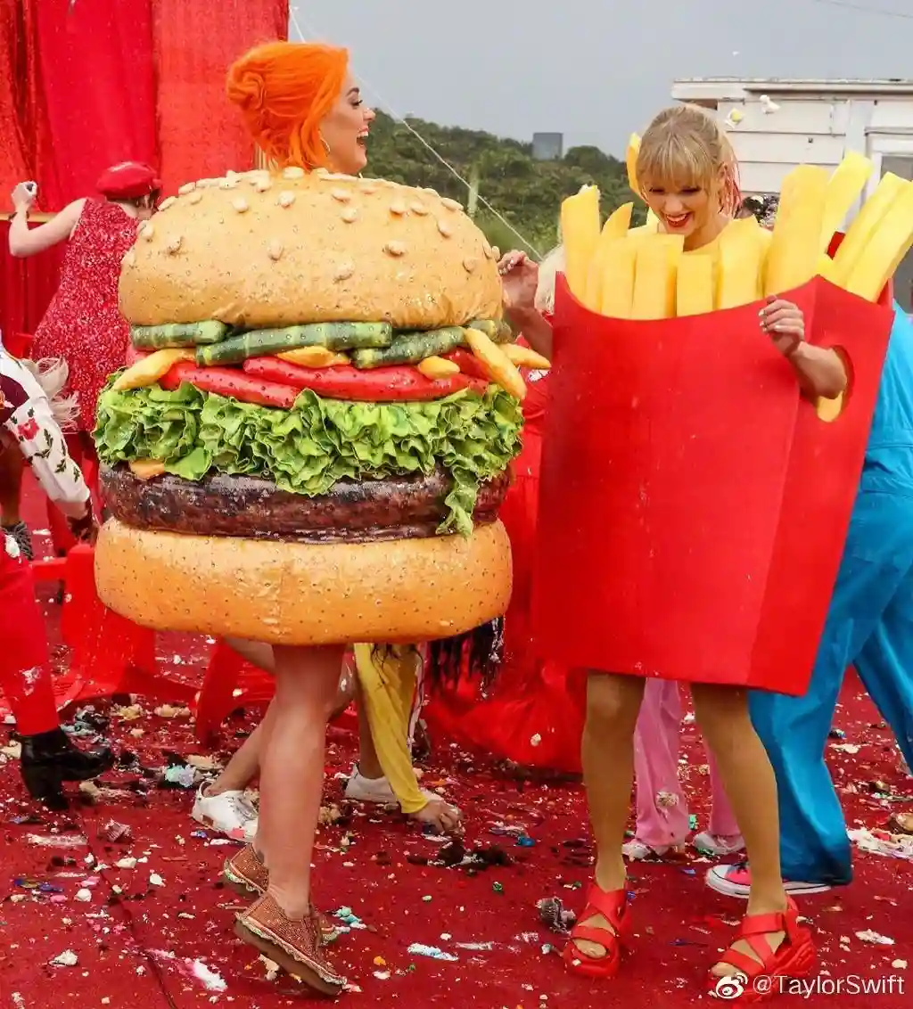 而关于汉堡和薯条的造型,也是因为霉霉看到了Katy在MetGala的Afterparty上的汉堡造型,觉得又酷又有趣
