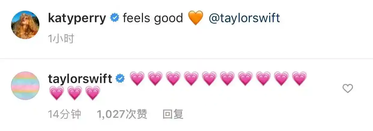 霉霉提到当时水果姐的回应还非常感动,Katy表示非常愿意彼此能够拥有一个挽救和原谅的象征。默契如初,霉霉也是这么想的