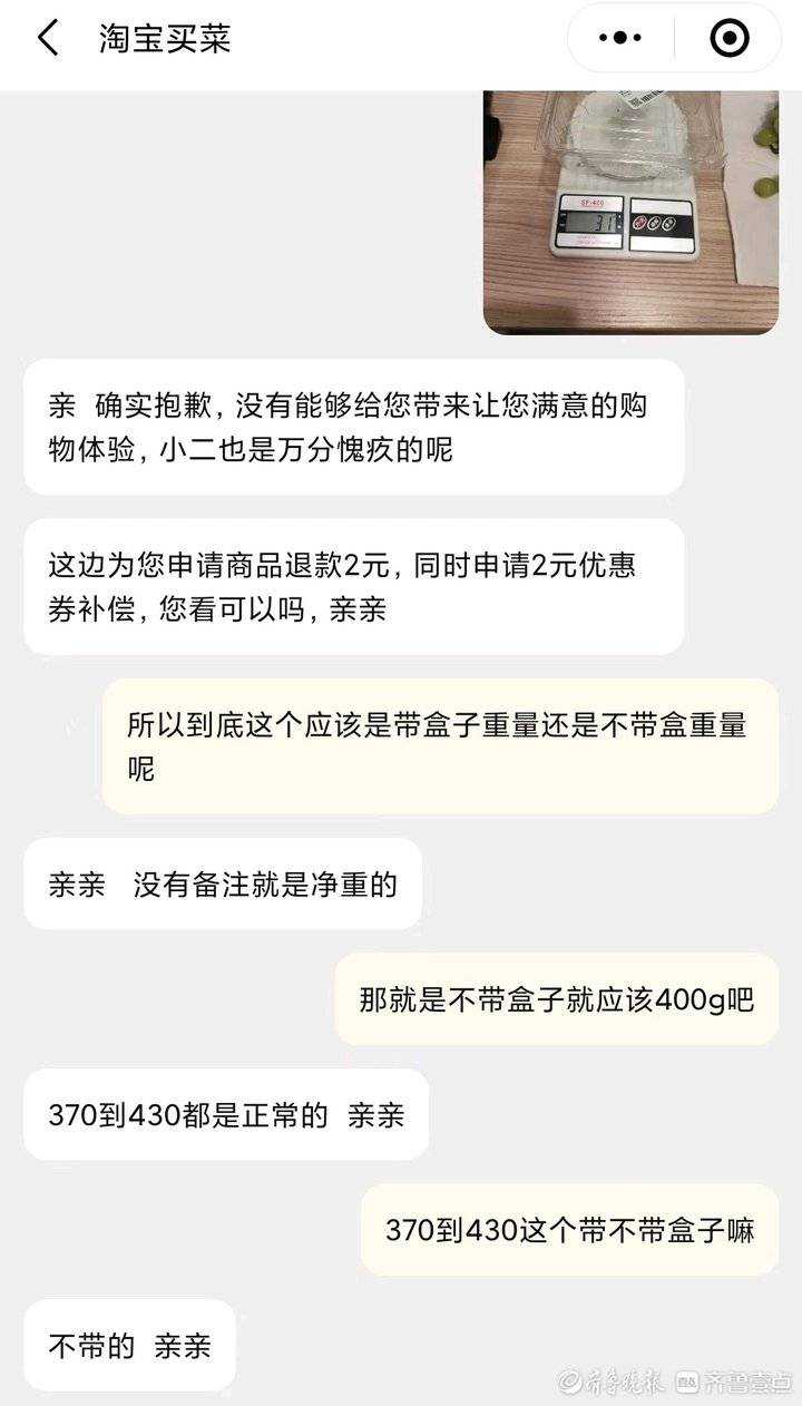 记者致电多多买菜的官方客服,客服表示水果的实际重量不包含盒子重量,“淘菜菜”的客服称:“没有备注重量就应当是净重”。