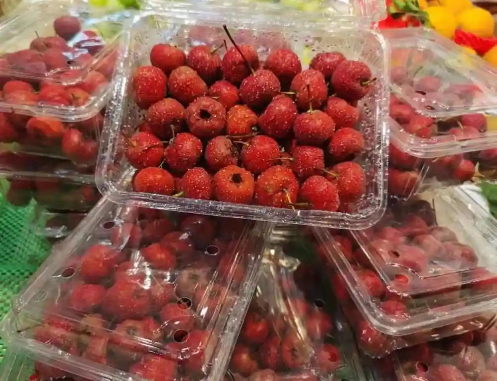 美天新渔菜市场里售卖的山楂也很特别,是产自山东沂蒙的新品种——樱桃山楂,售价15.8元/斤。个头较小,口感没有普通山楂的酸涩感,甜度适中。山楂健胃消食,也是秋季的时令水果,在菜场中占据了一席之地。