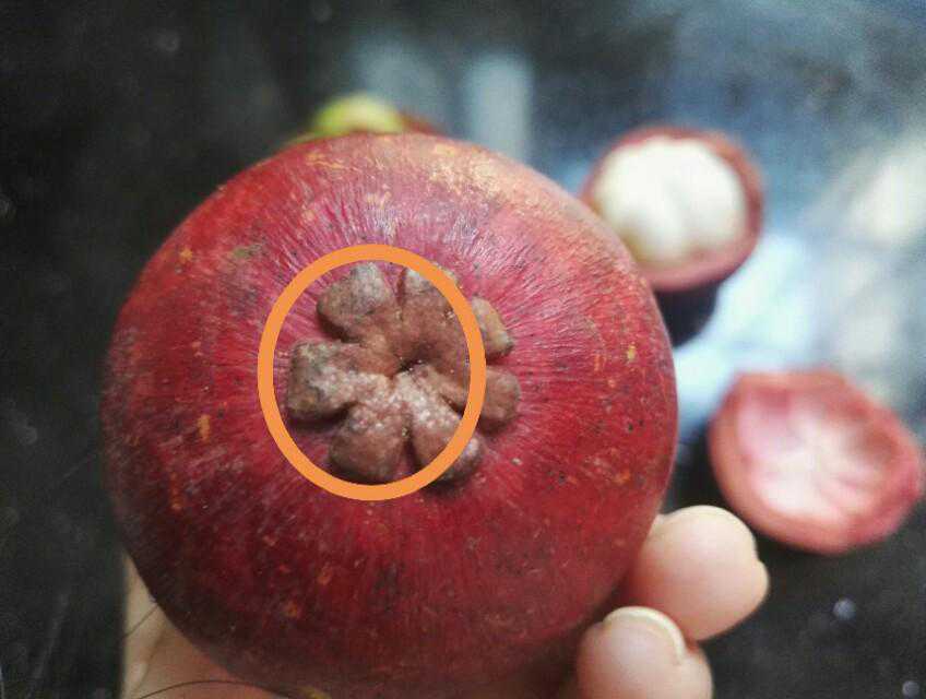 2、看山竹底部的萼片(下图圈起来的部分),也就是那个硬结,看起来像花瓣一样,有几瓣萼片就有几瓣果肉,一般是4~8片,所以我们就要选瓣数多的,通常有7、8瓣果肉的,里面的核也很少。
