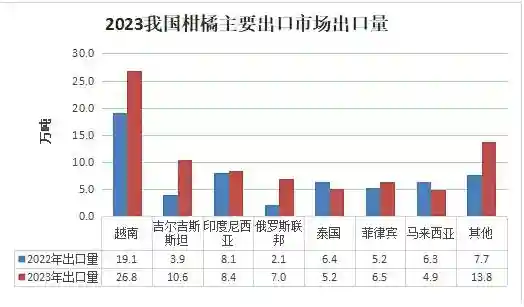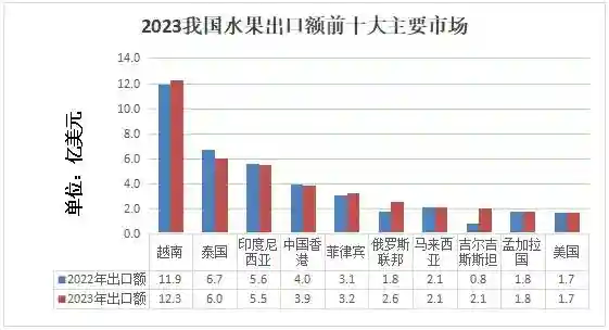 2023年我国水果出口额49.8亿美元,同比增长8%;出口量386.8万吨,同比增长19%。依出口金额,我国水果主要出口品类依次为鲜苹果、柑橘(包括小蜜橘及萨摩蜜柑橘)、鲜葡萄、鲜梨、葡萄柚及柚等,主要出口市场为越南、泰国、印度尼西亚、中国香港和菲律宾等地。