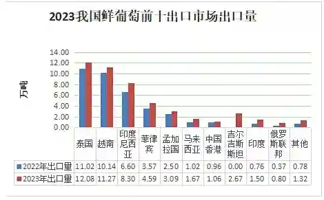 2023年,我国鲜葡萄出口金额8.1亿美元,同比增长12%,出口数量48.3万吨,同比增长28%。主要出口市场为泰国、越南、印度尼西亚、菲律宾、孟加拉国等。